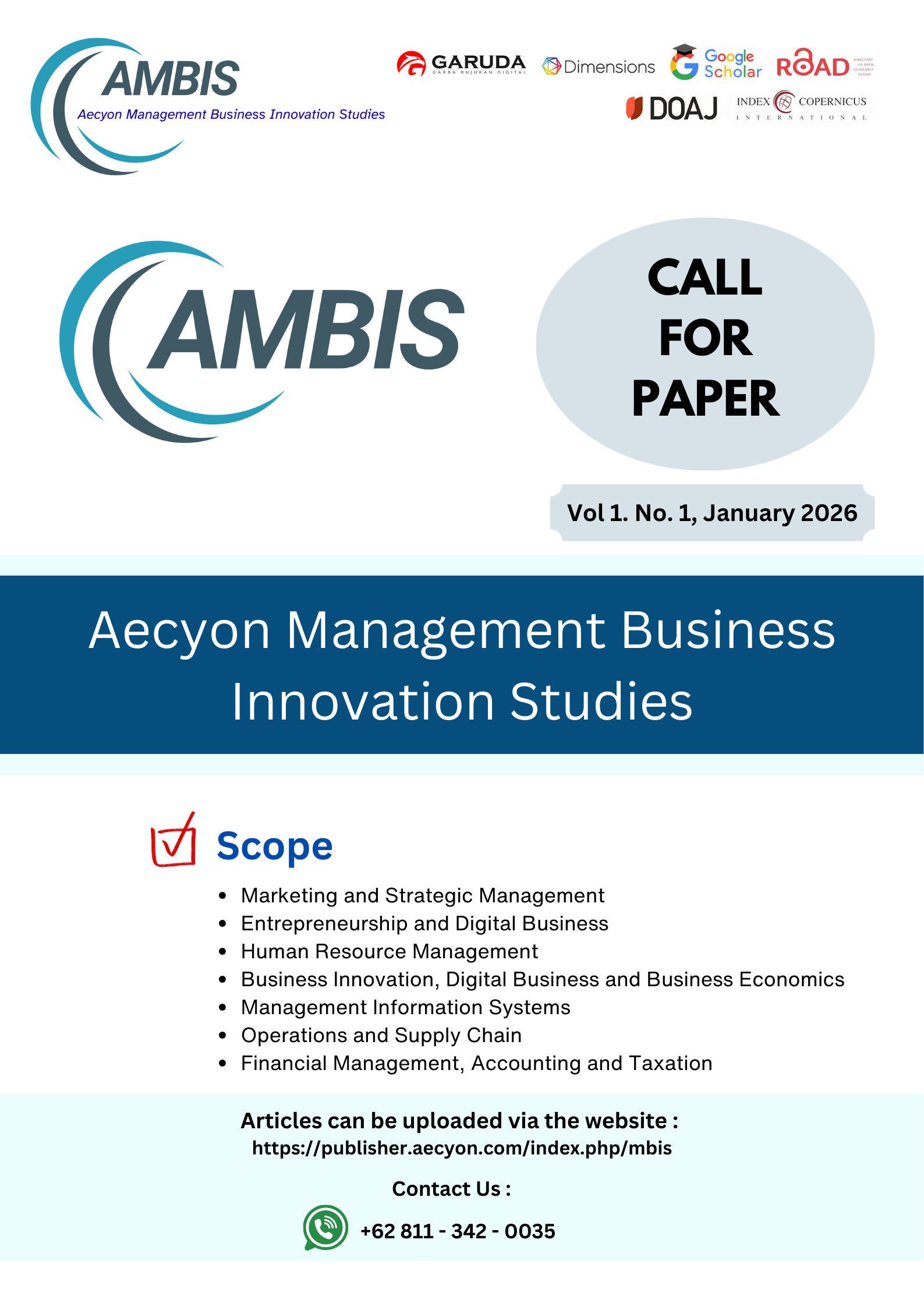 Aecyon Management Business Innovation Studies (AMBIS) is an open access and peer-reviewed scientific journal published by Aecyon Publishing. This journal serves as a means of publication for academics, researchers, practitioners, and students to disseminate quality research in the fields of management, business, entrepreneurship, digital innovation, and strategic leadership.AMBIS publishes conceptual and empirical articles on various topics such as Marketing, Strategy, Finance, Human Resources, Entrepreneurship, Business Innovation, Digital Business, MIS, Supply Chain, Accounting, and Taxation. The journal is published twice a year (April and November) and implements a double-blind peer review process to ensure objectivity and scientific quality.AMBIS does not charge any article submission, processing, or publication fees (APC = 0). Each manuscript is checked using Turnitin and must adhere to ethical standards based on COPE guidelines. Articles are published under a Creative Commons Attribution 4.0 (CC BY SA 4.0) licence.AMBIS is indexed in Google Scholar, Garuda, Dimensions, ROAD, and is currently undergoing indexing in DOAJ, SINTA, and BRIN. Content sustainability is maintained through LOCKSS and CLOCKSS.